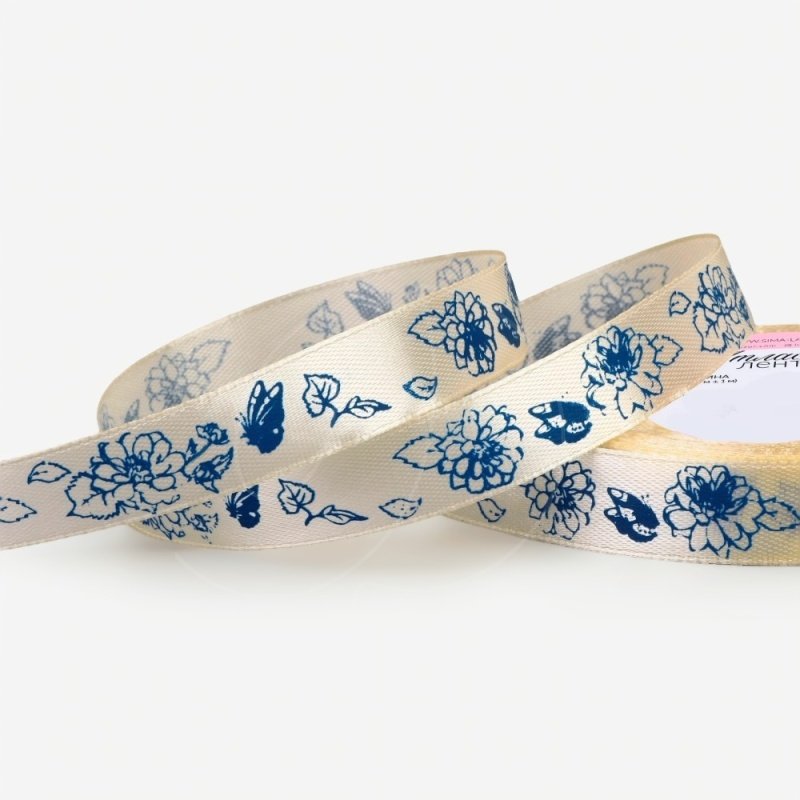 Лента для декора и упаковки атласная "Пионы" Кремовая 1,5 см 23 м